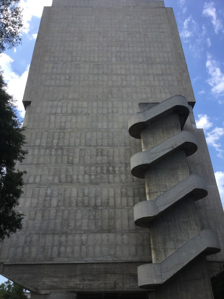 Mot fasaden ser man videre en forhøyet fjerdeetasje som er markert med en innfelt balkong hvor en serie pilotis, i følge Corbusiers vokabular, antyder byggets bærende elementer. Denne forhøyede etasjen synliggjør også volumet av det store forsamlingslokalet inne i bygget.