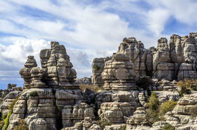 Etter vel en times kjøring, nord for Málaga, støter vi på det måneaktige landskapet som heter El Torcal. Hele dette fjellpartiet var havbunn for millioner av år siden. Nå regnes området som et av de mest særegne, såkalte karstlandskap i verden, med sine rungende stabler av steinskiver i høye tårn, og sine underjordiske grotter og vannkanaler.